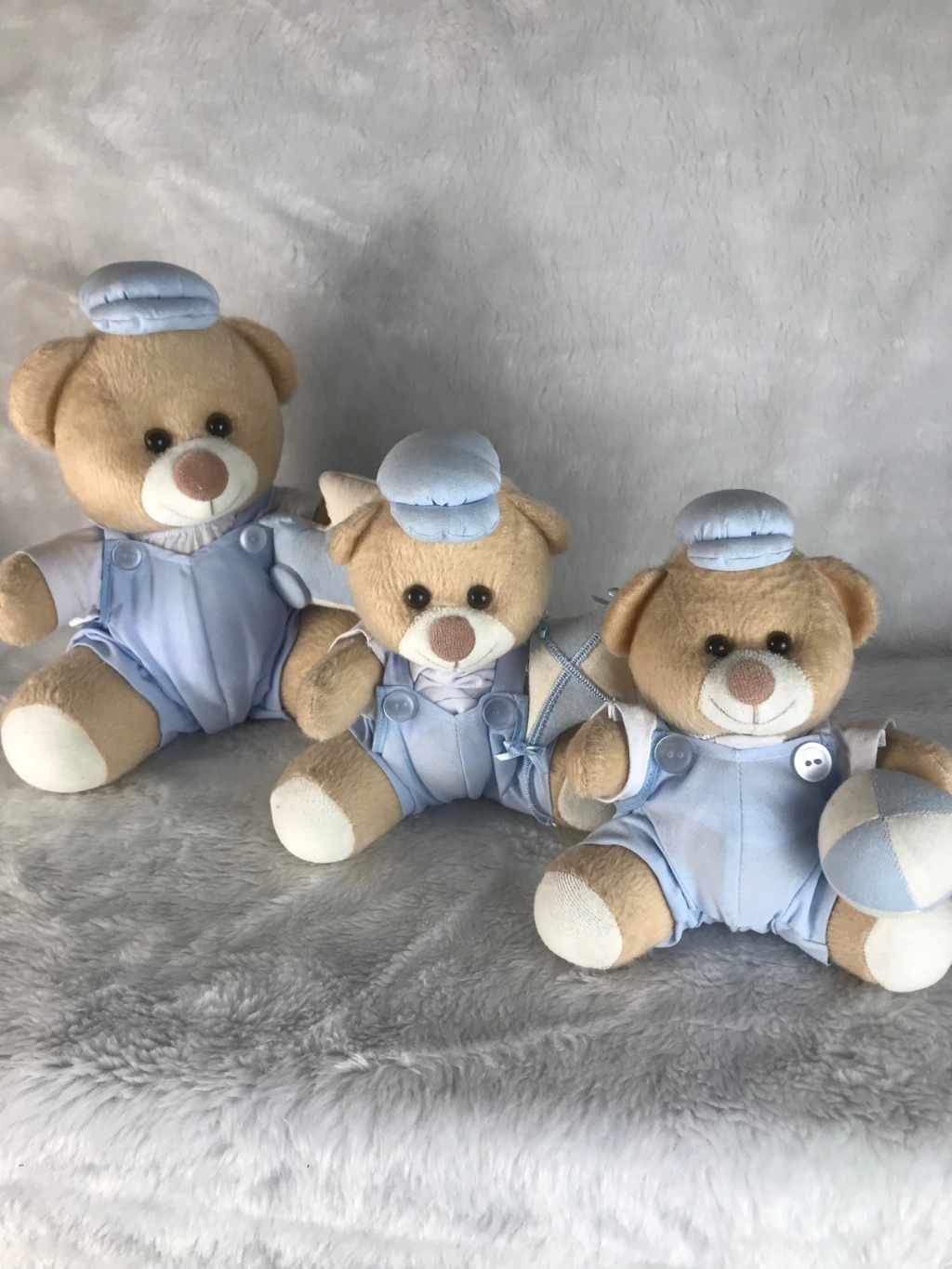 O nosso encantador trio de ursos na linha brinquedos, vem com uma roupa temática composta por uma jardineira e cada urso segurando um acessório, além de um lindo boné. Esses acessórios deixam toda a roupa do trio com um toque muito lindo e agradável, onde cada detalhe é feito com todo amor, pensando no melhor para os nossos clientes.